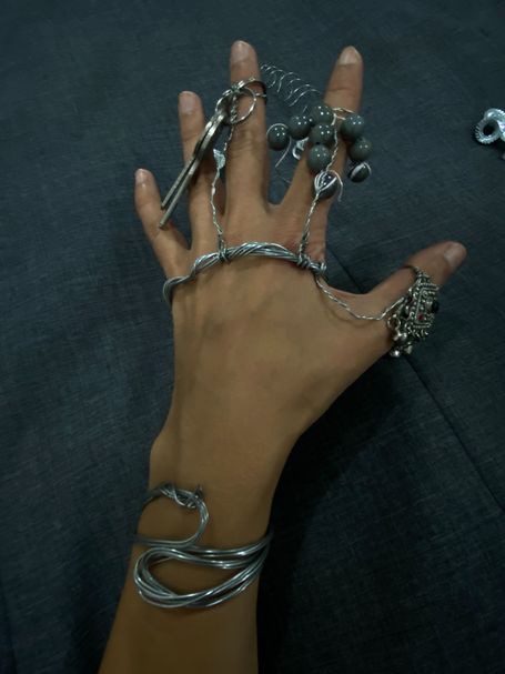 One consideration for cyborgization is maintaining our status quo in terms of capabilities and in the medical sense. However, I considered this to be only an introducing stage of the process of becoming cyborgs, the step following will be less driven by a sense of medical necessity but will more be motivated by our sense of competition, our willingness to go further and further in the quest of dominance, power and social status. So I directed my thoughts towards how we could use new technologies to further improve our human capacity and maybe even those human attributes that we do not appreciate, e.g. habits. I created a piece of ‘jewelry’ that would allow us to hear the movements of our body, or hands in particular. What our hands do and how the different movements sound. A way to call our actions into our active consciousness by means of sound.